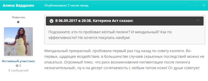 Своим опытом делится и следующий косметолог, отмечая главные достоинства химических пилингов. Но на первом месте ставит очищение миндальной кислотой.