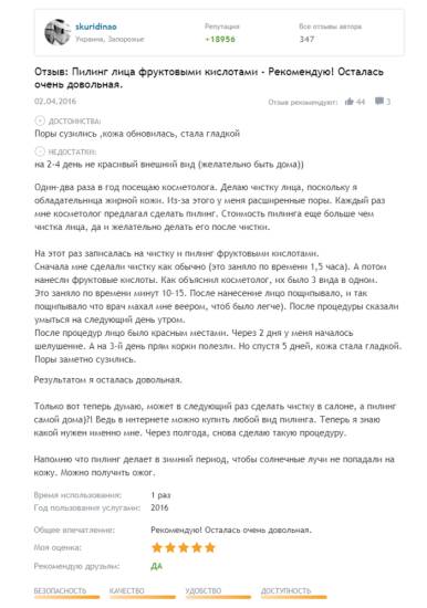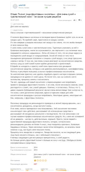 Следующий пользователь делится своим опытом в очищении кожи фруктовыми кислотами. Только использует она не готовые косметические препараты, а натуральные фрукты. Порядок проведения процедуры, ее особенности, конечный результат — предлагаем оценить в следующем отзыве.