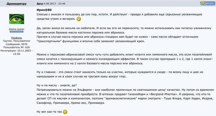 Дополнить систему ухода можно обогащением привычной косметики анисовым эфиром (не более 3–5 капелек на 10 г основы), использованием ароматерапии дважды за день (3–4 капельки масла в лампу).