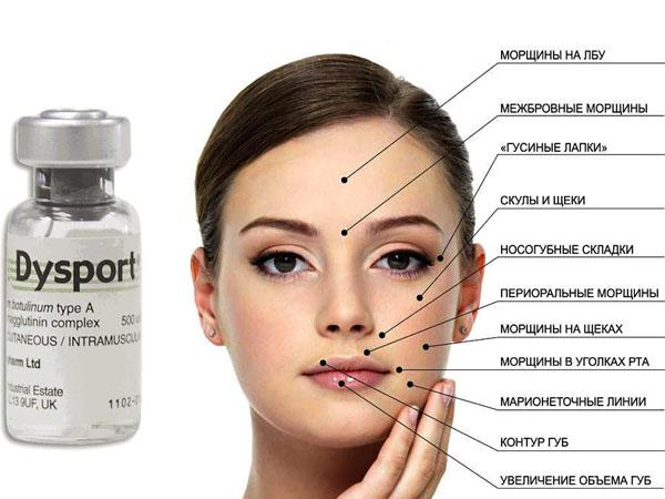 Диспорт — это уколы французского ботулотоксина. Попадая в мышцы лица, токсическое вещество слабой концентрации парализует их, не давая сокращаться. Следовательно, дерма натягивается и уходят даже глубокие морщинки. Недостатком подобной процедуры является то, что теряется естественность и природная мимика. После инъекций ботокса пациент не может улыбаться или хмурится, как делал это ранее.