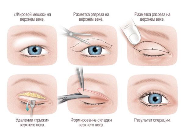 Алгоритм проведения верхней блефаропластики предполагает следующие этапы: