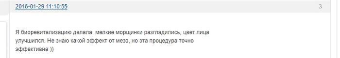 Пользователь пишет об эффекте биоревитализации для устранения мелких морщин, а опыт проведения мезотерапии пока отсутствует.