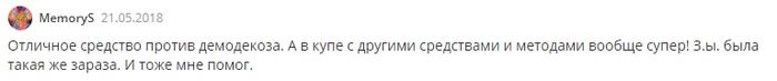Пользователь пишет о хорошем результате терапии в борьбе с демодекозом.
