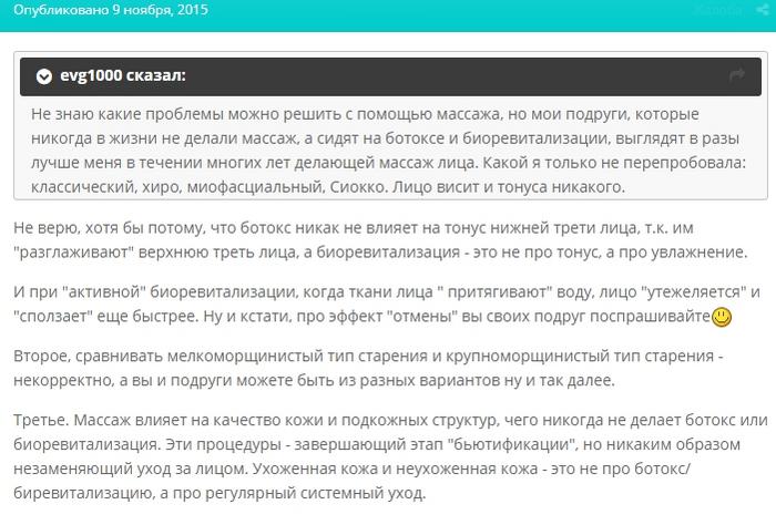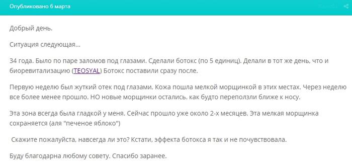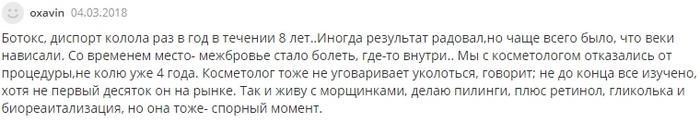 В отзыве описывается применение ботокса в течение 8 лет, иногда препарат давал нужный эффект, но чаще возникали побочные явления в виде нависших век. Сегодня автор предпочитает пилинги, биоревитализацию.
