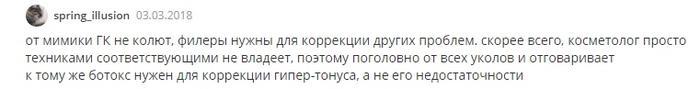 Пользователь пишет, что гиалуроновую кислоту для восстановления мимики не колют, а ботокс используют для коррекции гипертонуса.
