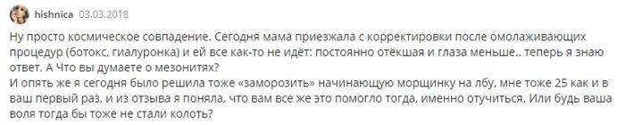 Пациент описывает последствия одновременного введения ботокса и биоревитализанта. Указывает отсутствие эффекта токсина, а также смещение новых морщинок ближе к носу.