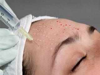По запланированным точкам выполняют инъекции. Используют микроиглу. Шприц вводят под углом 45 градусов под кожу на глубину 2–4 мм. Внутримышечную обработку не используют. Препарат впрыскивают малыми порциями (1–4 единицы) до образования компактной папулы. Расстояние между проколами при инъекциях составляет не менее 1 см.