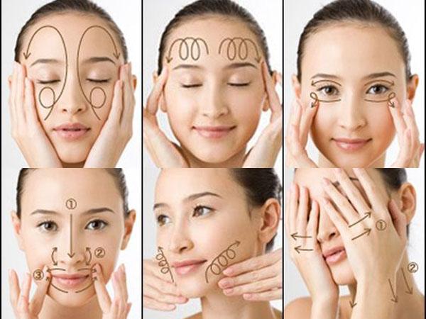 - Тыльной стороной ладони с упором на большой палец придавливаются скулы, щеки (пальцы согнуты на 2/3).Движения постепенно направляются к лобной части.