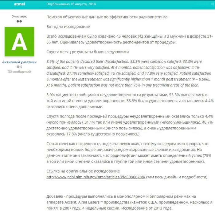 Небольшой экскурс в исследования по эффективности радиочастотного лифтинга предлагает следующий участник. Как видите, только 4,4% остались недовольными итогом радиоволнового воздействия, остальные высказались положительно о процедуре.