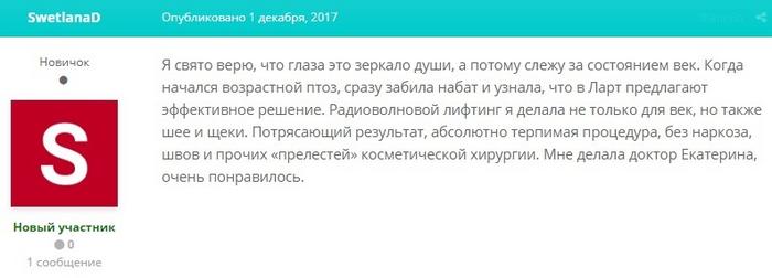 В этом отзыве пациентка восхищается достигнутым эффектом, подчеркивая отсутствие необходимости наркоза и безболезненность радиочастотного лифтинга.