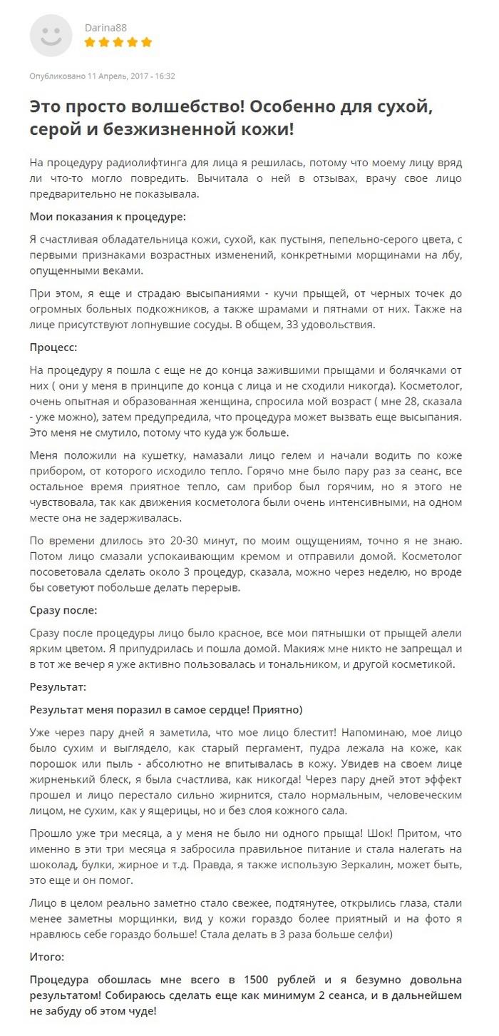 Мнение косметологов в вопросах эффективности радиолифтинга сходятся. Процедура действительно заслуживает внимания, оправдывает потраченное время и средства.