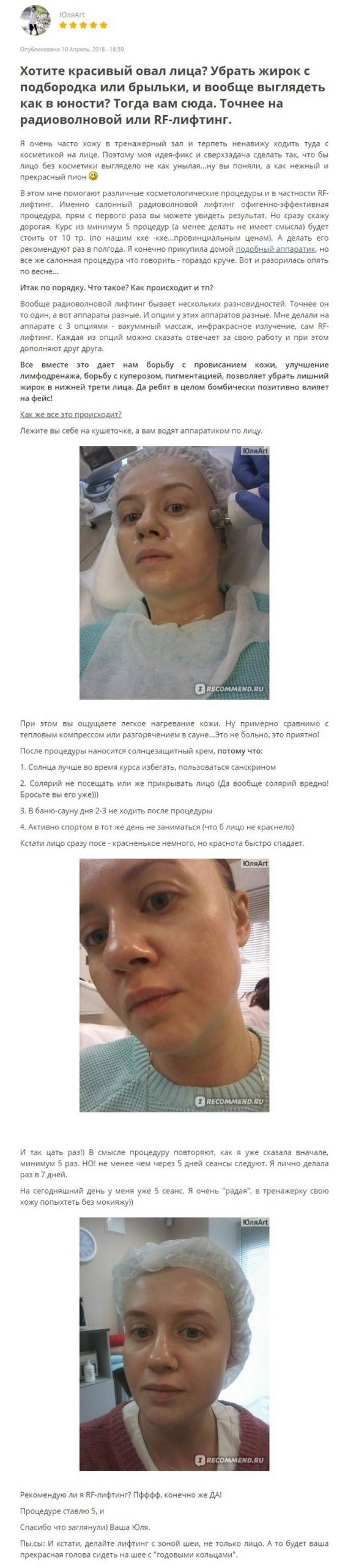 Пациентка Юлия не менее восторженно отзывается о радиочастотном лифтинге. Эффект воздействия можете оценить самостоятельно по фото до и после.