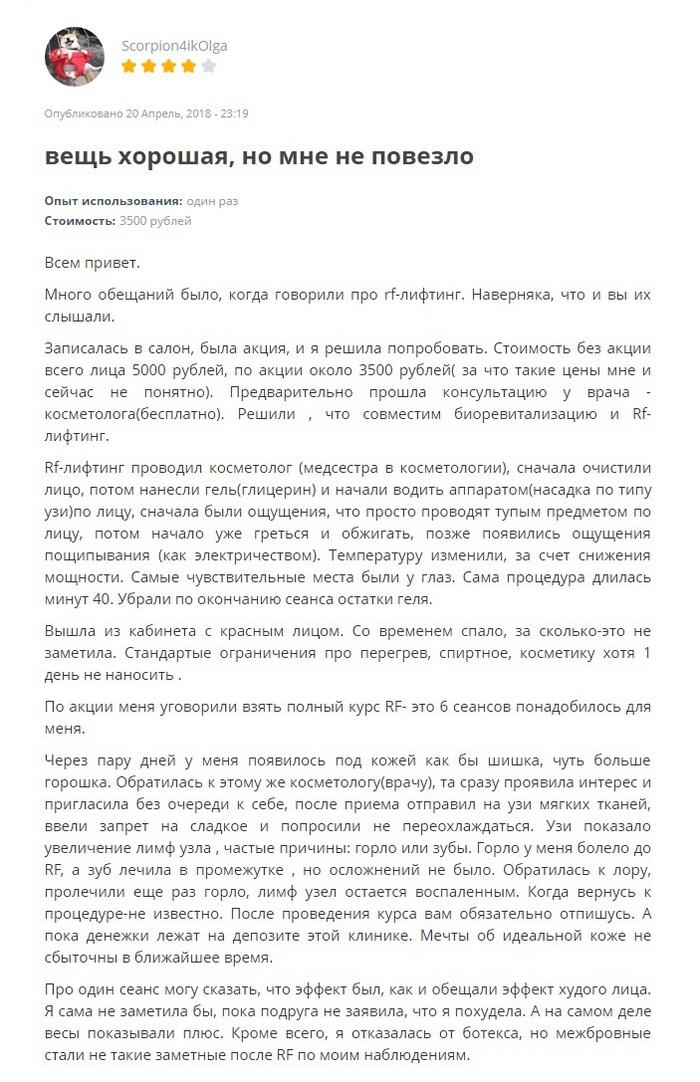 Следующий отзыв еще раз доказывает предостережения и рекомендации косметологов, не скрывать проблемы со здоровьем. Незначительные проблемы с горлом, зубами (как в этом случае) привели к воспалению лимфоузла после проведенного радиочастотного лифтинга.