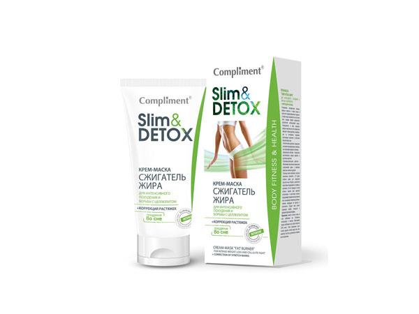 - Compliment Slim & Detox. Маска сжигатель жира с каолином, эластином. Средство оказывает очищающий, оздоравливающий эффект. Тубы маски продают по 200 руб.