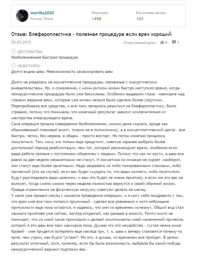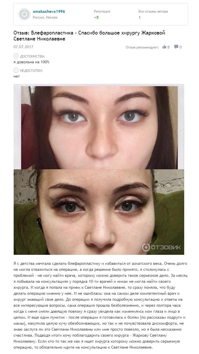 Пациенты от лазерной блефаропластики в восторге. Как и косметологи, они заостряют внимание на выборе лечащего врача, клиники. Пластика век — не та процедура, на которой стоит экономить. Нередко такая экономия приводит к затяжной реабилитации, асимметрии глаз.