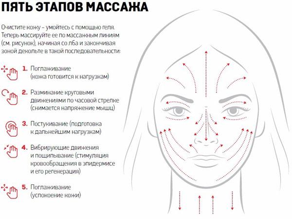 Манипуляции проводятся по часовой стрелке подушечками пальцев вдоль массажных линий, не затрагивая область вокруг глаз.