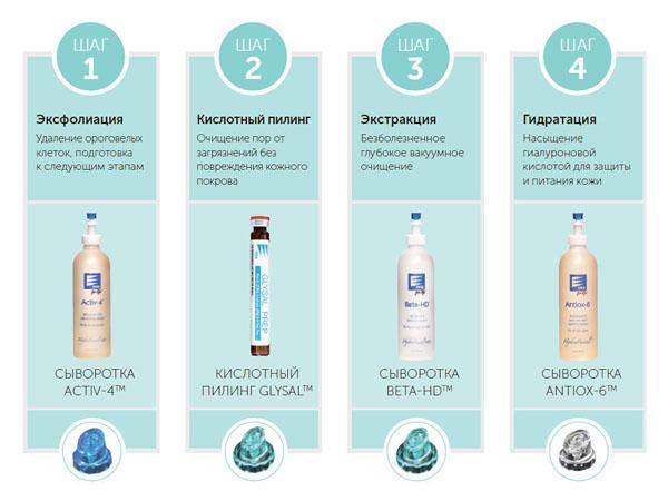 - Эксфолиация. С лица снимается макияж, его обрабатывают насадкой с постепенной подачей сыворотки Activ-4. В ее состав входят молочная кислота, глюкозамины, фруктовые кислоты, гиалуроновая кислота, витамины. Комплекс смягчает роговой слой и способствует тщательному очищению.