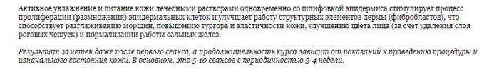 Эпидермис обновляется, происходит лифтинг и регуляция работы сальных жалез. Процедура не устраняет глубокие морщины и шрамы.