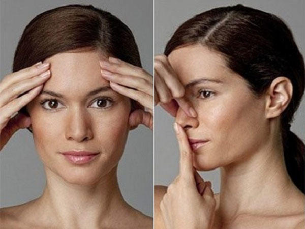Упражнение предназначено для подтяжки лобных мышц. Указательные пальцы размещают параллельно бровям в центральной части лба. Подушечками пальцев мягко, но с усилием давят на кожу, оттягивая вниз. Фиксируют пальцы в таком положении. Взгляд устремляют вверх. Одновременно с нажимом пальцев на лоб стараются бровями вернуть его на место. Повторяют действия 20 раз.