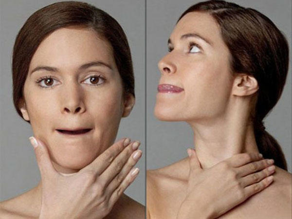 Укрепление линии подбородка, шеи. Голову запрокидывают, максимально поднимая подбородок. Улыбаются, не показывая зубы. Тянут кожу под шеей вниз. Смотрят влево, напрягаются, считают до 10. Аналогичные действия делают, смотря вправо. Возвращаются в исходное положение.