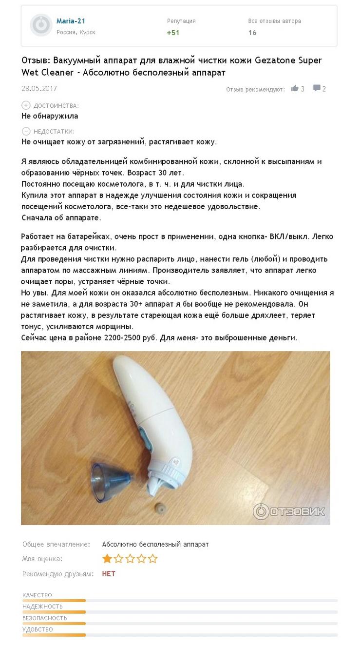 В этом отзыве пользователь говорит, что аппарат Gezatone Super Wet Cleaner абсолютно бесполезен.