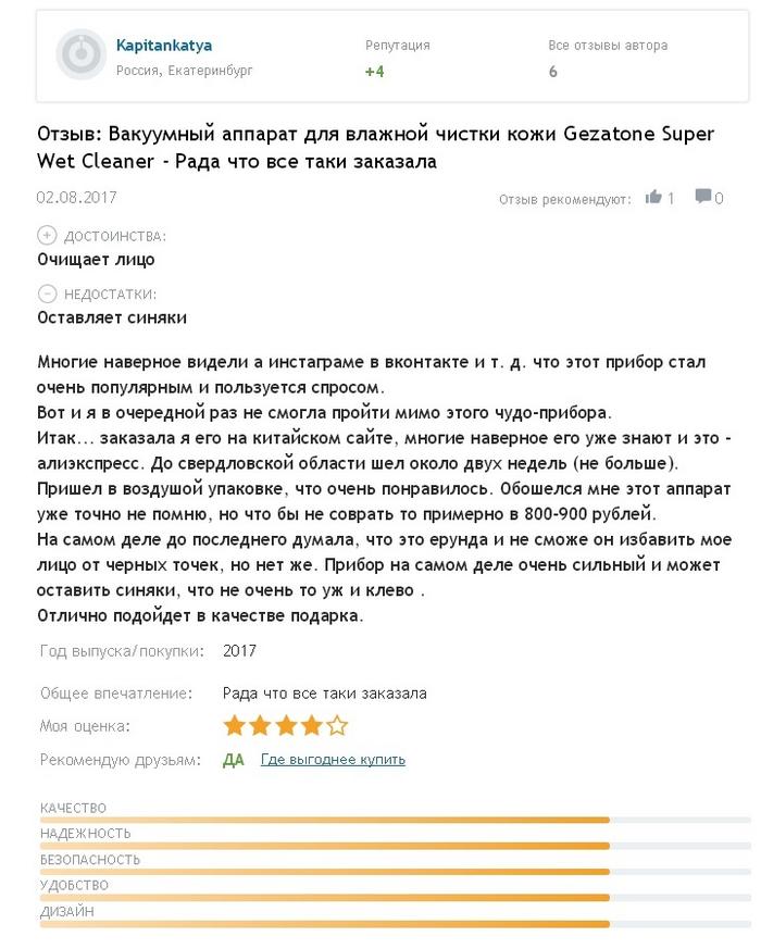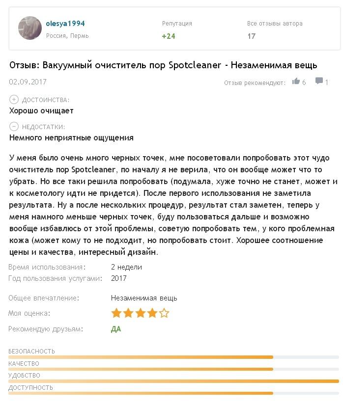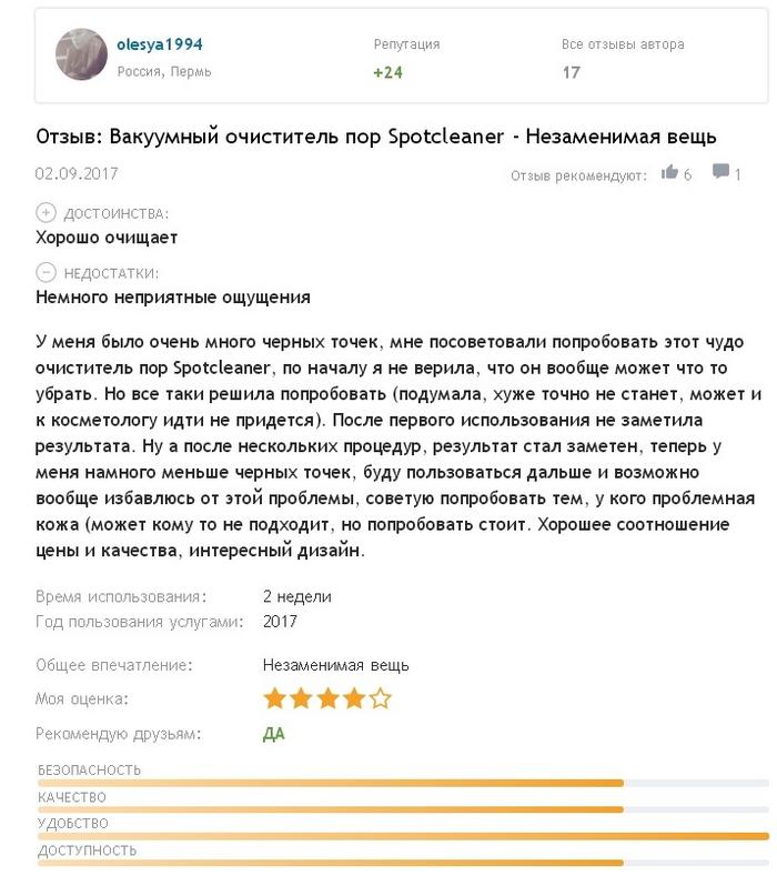 Не менее противоречивые отзывы оставляют пользователи о вакуумном очистителе Spot Cleaner. Этот клиент остался в восторге о приборе, считает его незаменимым помощником в уходе за лицом.