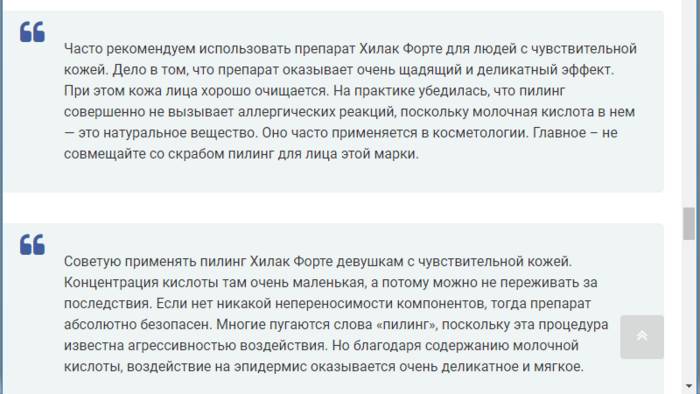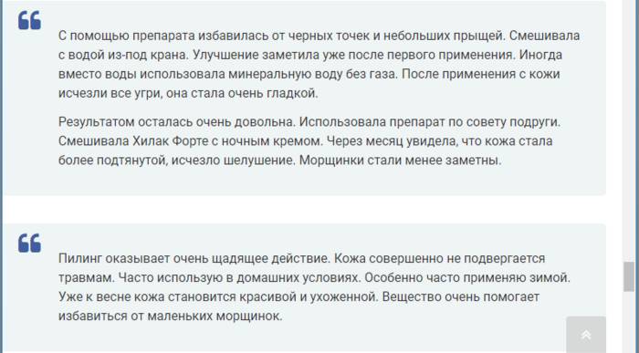 Косметолог подчеркивает, что пилингом с применением Хилак форте могут пользоваться и обладательницы сухой кожи, так как он оказывает щадящее воздействие. Но настоятельно рекомендует не совмещать со скрабом-пилингом данной марки.