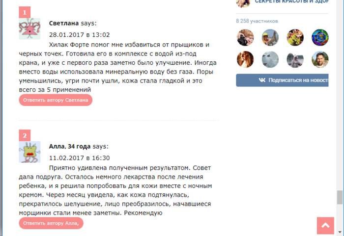 Пользователь 1 делится опытом избавления от черных точек и прыщей с помощью Хилак форте, после первого применения заметен результат. Повторяя процедуру 5 раз, состояние кожи заметно улучшилось.