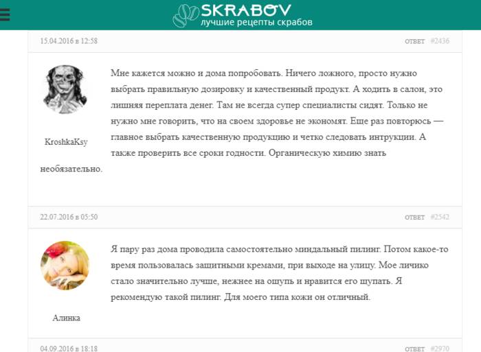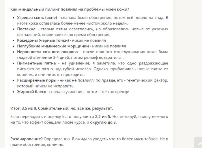 Люди по-разному отзываются о миндальном пилинге. Некоторые считают, что он положительно действует на состояние кожных покровов, другие же полагают, что он неэффективен.