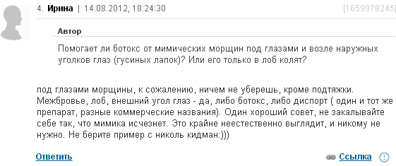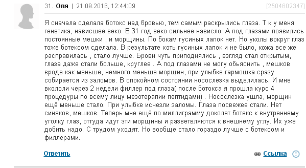 Участник пишет о неэффективности ботокса при морщинах нижнего века, а также дозировке, которая приводит к неестественному виду.