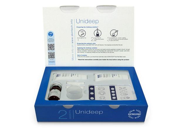 - Пилинг UNIDEEP 23% применяется для жирного типа кожи с расширенными порами, нарушением пигментации, при наличии шрамов и рубцов. Эффективно для избавления от следов фотостарения и глубоких морщин. Воздействие направлено на глубокий слой эпидермиса, после процедуры отмечается выраженный эффект лифтинга и общего омоложения кожи. Состав включает трихлоруксусную кислоту 23%, сапонины, аскорбиновую, лимонную кислоту.