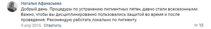 Автор этого отзыва тоже хвалит срединный химический пилинг, который избавил ее от пигментации, появившейся во время беременности. Дополнительно проблему усугубило воздействие солнечных лучей (женщина активно загорала).