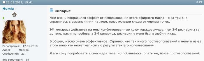 Эфирное масло кипариса в большинстве случаев получает положительные оценки пользователей. Средство дает положительные результаты, удовлетворяет ожиданиям потребителей. Негативной стороной является то, что многие боятся пробовать эфир из-за боязни негативного влияния, противопоказаний.
