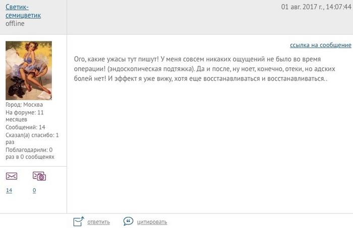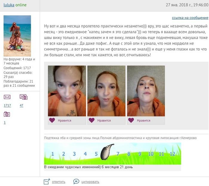 Пациентка высоко оценивает достижения пластики лба и средней трети. Результаты впечатляют окружающих.