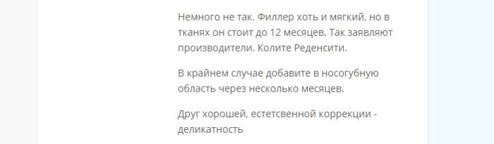 О том, что в первый день трудно определить, введен ли филлер в достаточном количестве, упоминает косметолог, отвечая на обращение пациентки. И объясняет, что виден окончательный результат будет через две недели.