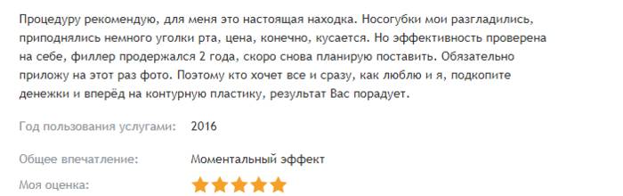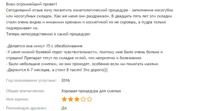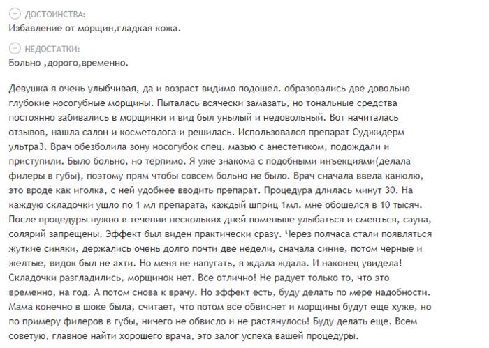 Своим опытом разглаживания носогубок, появившихся в 25-летнем возрасте, делится девушка в этом отзыве. Тоже отмечает болезненность процедуры, и что после нее были небольшие синяки, которые быстро ушли. К недостаткам относит дороговизну контурной пластики и непродолжительность эффекта.