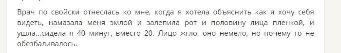 Не обходится и без печальных последствий. Эта пациентка стала жертвой недостаточной квалификации врача. Она рассказывает, что процедура «пошла» плохо с самого начала. После нанесения анестетика все жгло, но не замораживалось. И даже не проверив состояние девушки, дерматокосметолог принялась за введение инъекций с гелем.