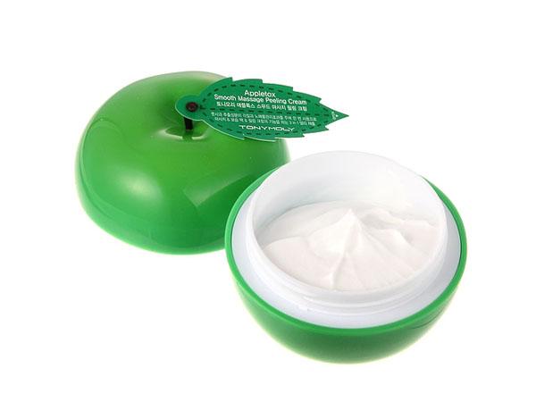 Один из наиболее узнаваемых корейских пилингов — Appletox Smooth Massage Peeling Cream, который выпускается в оригинальном флаконе в виде зеленого яблока весом 80 г, Помимо яблочного экстракта, сюда входит вытяжка папайи и AHA-кислоты. Средство в виде крема очищает поры, делает лицо гладким и сияющим. Производитель рекомендует использовать пилинг следующим образом: