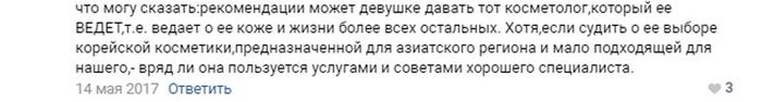 В тематических сообществах профессионалы редко оценивают косметику, не предназначенную для использования в салоне. А если и дают какие-то комментарии, то они, как правило, имеют негативный оттенок. В этом отзыве косметолог высказывает мнение, что корейская косметика — не лучший выбор для европейских девушек.