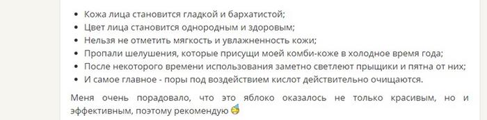 Не менее разноречивые отзывы собирает пилинг в виде яблочка Appletox Smooth Massage Peeling Cream. Девушка, оставившая этот отзыв, подробно и по пунктам расписала, в чем заключается положительное воздействие средства на кожу.