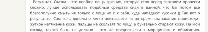 Автор следующего мнения считает, что пилинг агрессивен по отношению к коже, поскольку во время процедуры приходится сильно ее тереть.