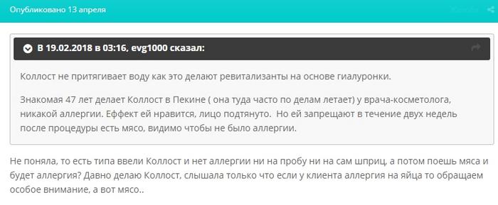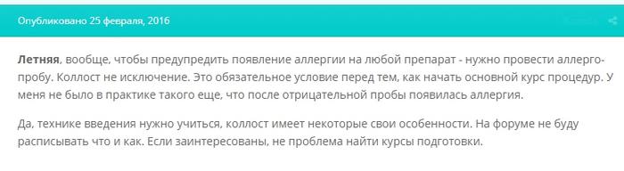 Специалист описывает применения инъекций своей знакомой, запрете в течение 2 недель на употребления мяса. Другой косметолог также работает с Коллостом, слышала об особенностях при аллергии на яйца.