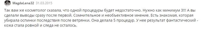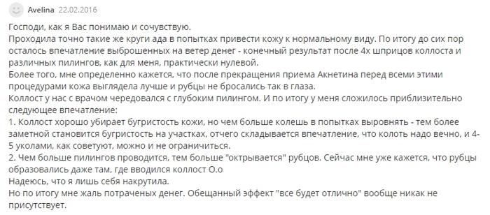 Пользователем указывается необходимость курсового проведения, вряд ли можно оценивать после 1 сеанса. Описывает опыт подруги успешно восстановившей рельеф кожи после ветрянки с помощью инъекций Коллоста.