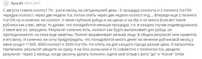В отзыве описывается использование инъекций в сочетании с пилингом для устранения глубоких рубцов. Пользователь пишет о длительности, высокой стоимости терапии, но эффективности для решения эстетической проблемы.