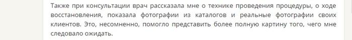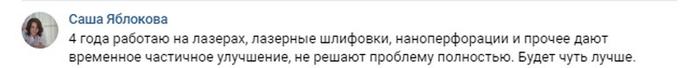 Чаще всего женщины выбирают лазерную процедуру для выравнивания кожного рельефа, для устранения рубцов, в том числе постакне. Девушка, написавшая этот отзыв, осталась довольна шлифовкой, которая помогла ей избавиться от давнего глубокого шрама на лбу. Для этого потребовалось несколько сеансов.