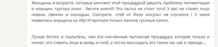 Также есть мнение, что эта процедура относится к радикальным методам воздействия на эпидермис. Рекомендуется выбирать ее в случае, когда иные косметологические манипуляции оказались бессильны.