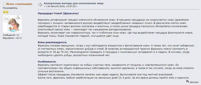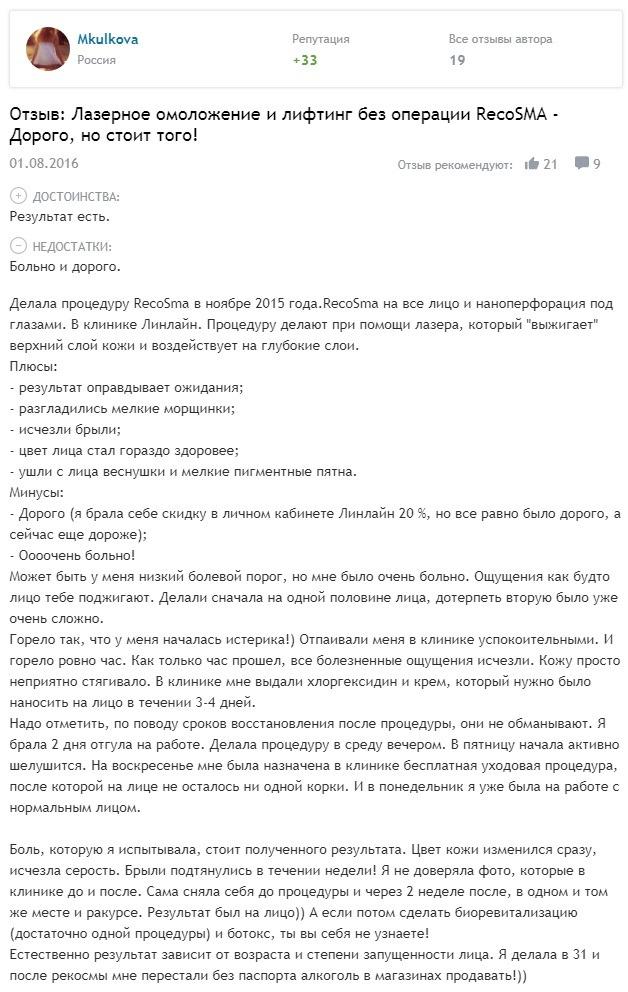 Следующая пациентка приготовила развернутый отзыв о процедуре лазерного лифтинга. Возможно, ее опыт пригодится многим при выборе метода омоложения.