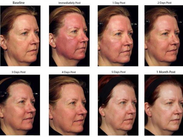- покраснение будет сохраняться около месяца, на его интенсивность влияют индивидуальные особенности, а также глубина воздействия лазера, качество защиты от ультрафиолета, влияние перепадов температур и других агрессивных факторов;
