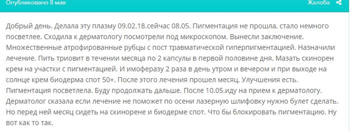 Автор пишет о последствиях плазмолифтинга, дерматолог рекомендует для коррекции осложнений осенью провести лазерную шлифовку.