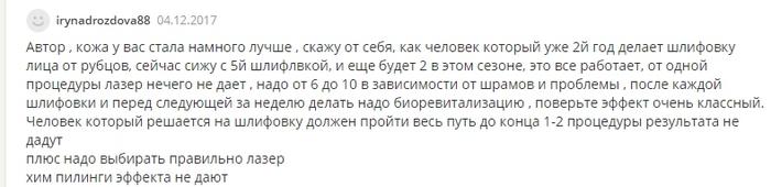 В отзывах пациенты обсуждают особенности косметологической методики. Складывается преимущественно положительное мнение об эффективности шлифовки.